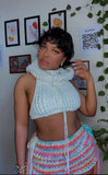 Turn heads in the Frostflare Crochet Set, a bold handmade two-piece that blends cozy texture with playful edge. Featuring a cream halter crop top with a removable hood and a vibrant rainbow mini skirt, this set is as versatile as it is eye-catching.